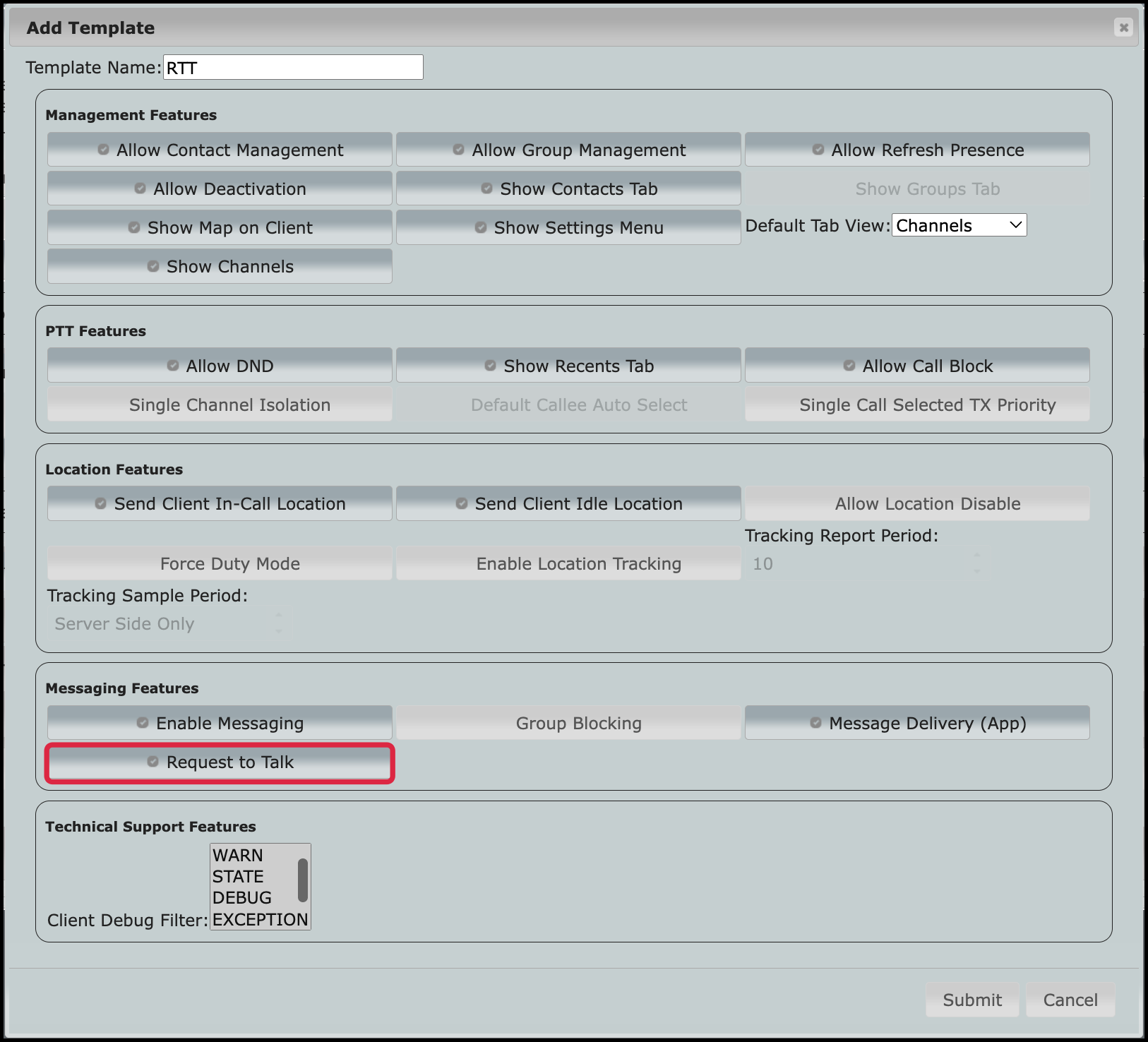 The request to talk (RTT) feature key setting lets a caller send a message requesting a call back when the call recipient is busy on another call. This option helps users who act as dispatchers to keep track of callers when they receive calls at a very high volume. The feature key must be enabled for the caller and all recipients and is available for Android, iOS and PC Client users.