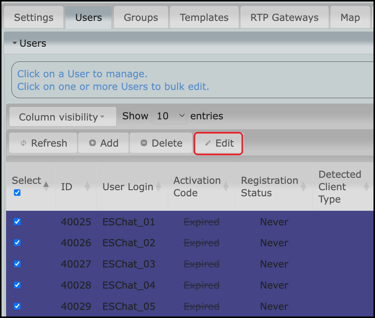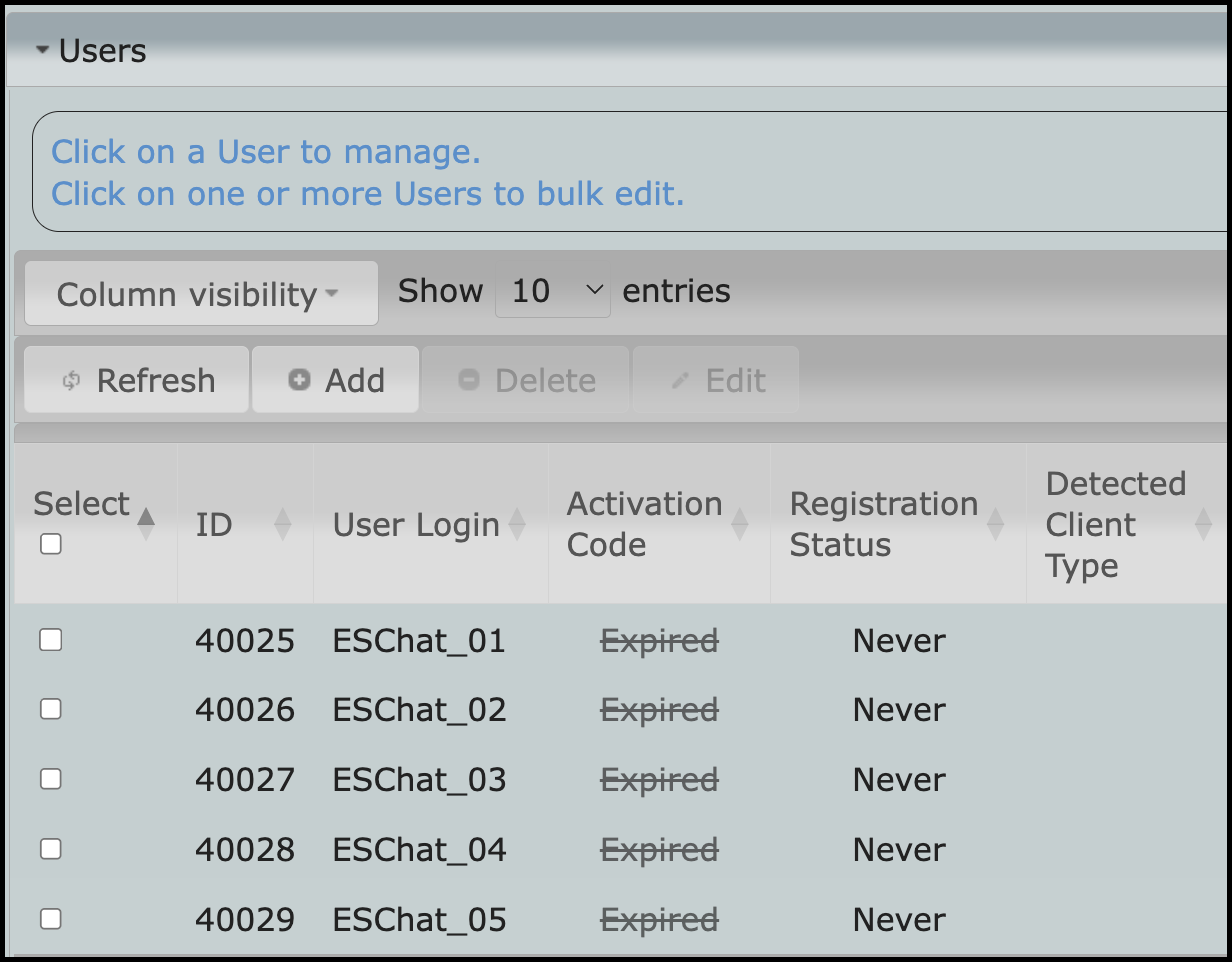 The user list will show that a user or users have never registered, and their activation codes have expired. Since no users have been selected, the delete or edit boxes are not available.