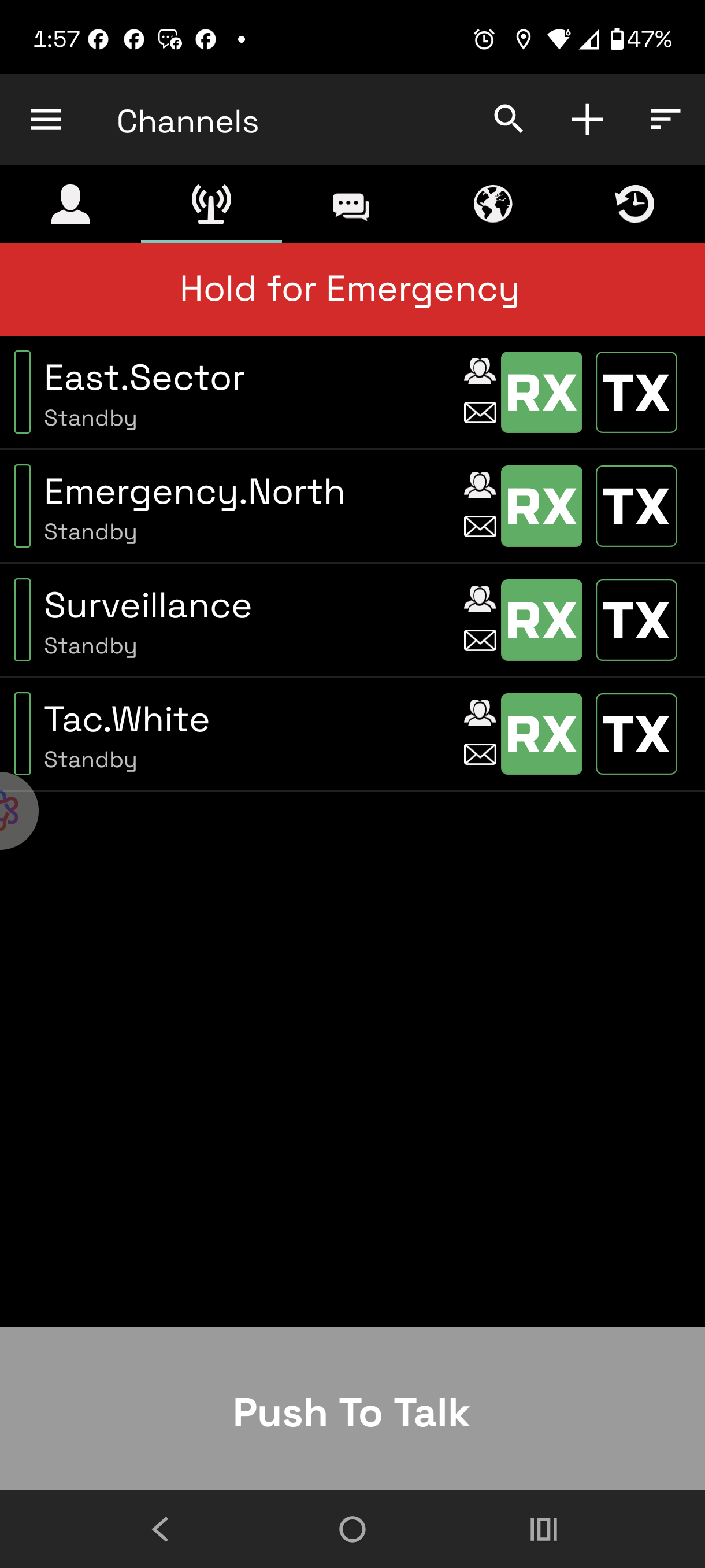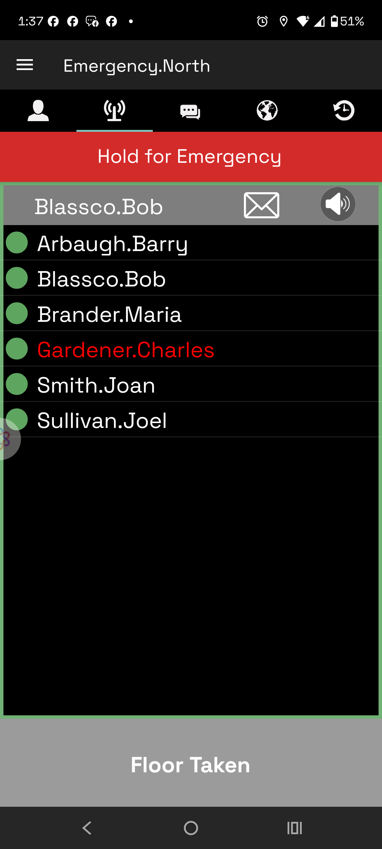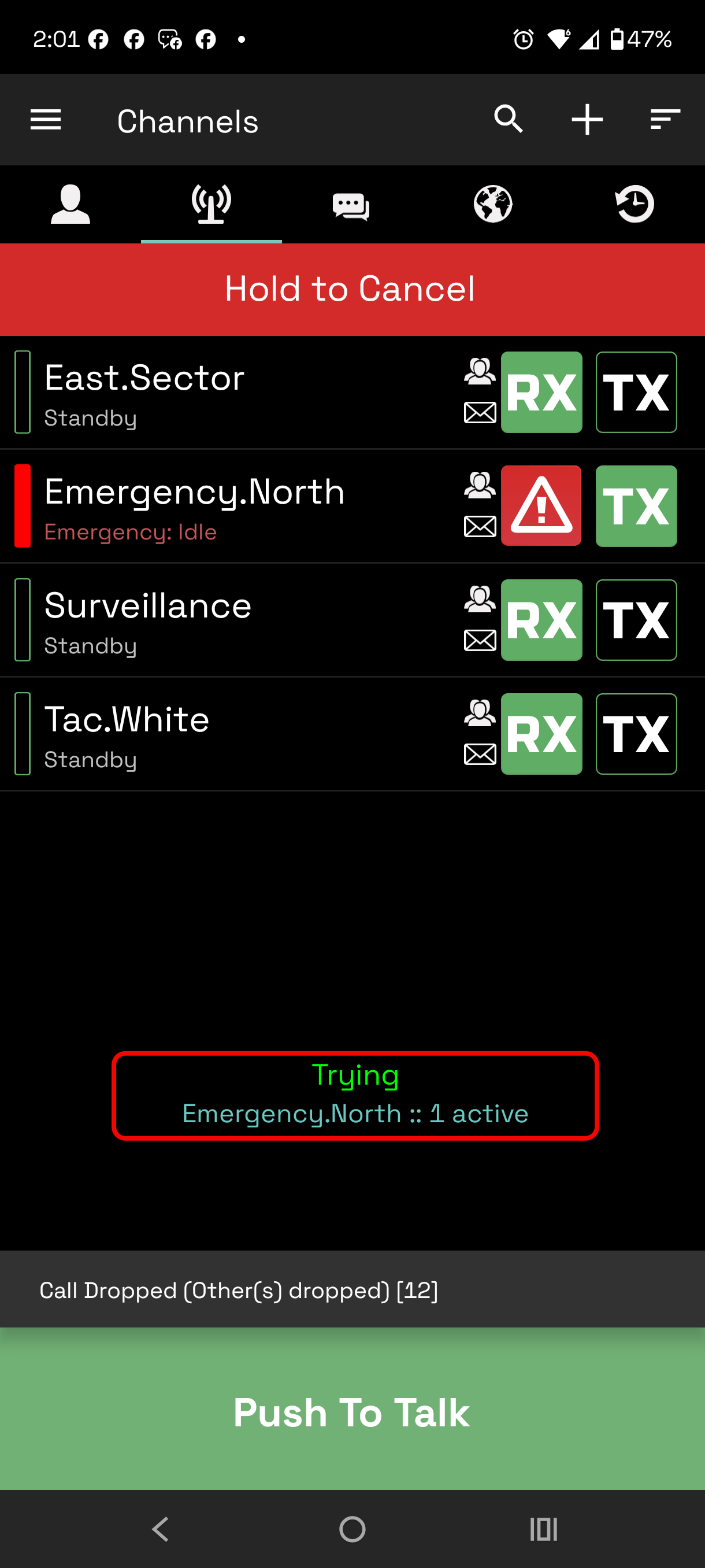 Any "Enterprise Closed" group created in the portal may be configured for individual users as an Emergency Call Group. Once the client settings are adjusted for each user, the Emergency call capability will be reflected on the screen by a red tab. Ruggedized phones with dedicated side PTT SOS button may be configured to trigger the Emergency PTT call. An Emergency call, when initiated, sends an insistent visual flashing signal and pulls recipients into the call. When the call initiator ends the Emergency call status, the call may be ended as just a usual call, with an idle timeout or a manual exit. Multiple callers may escalate a call into Emergency status. For information about configuring an Emergency group in the admin portal, click here.
