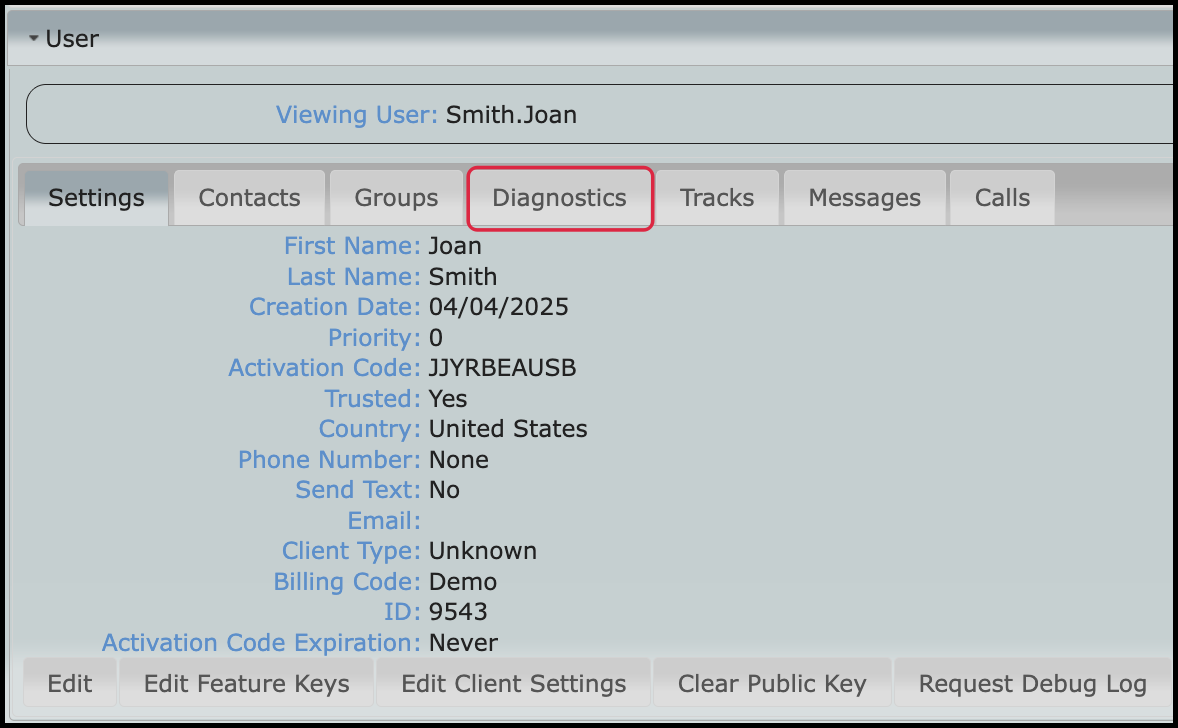 The Diagnostics tab displays information about the user and contains specific information from the most recent registration period.