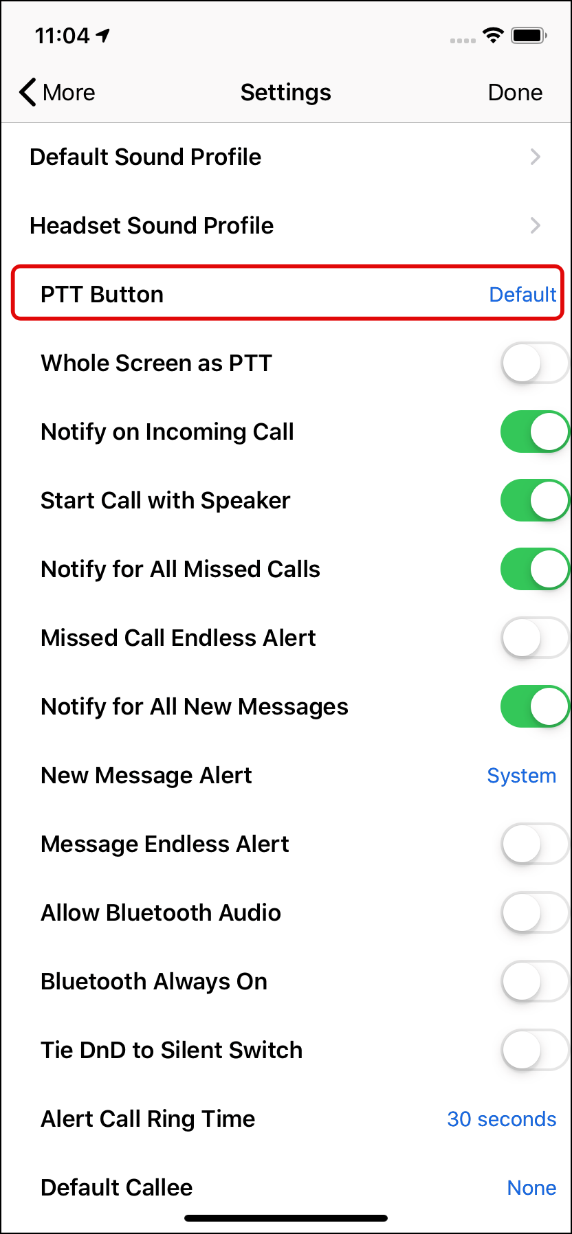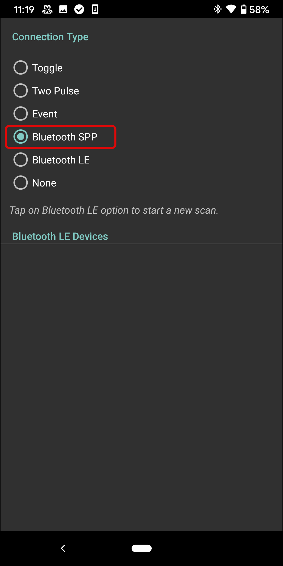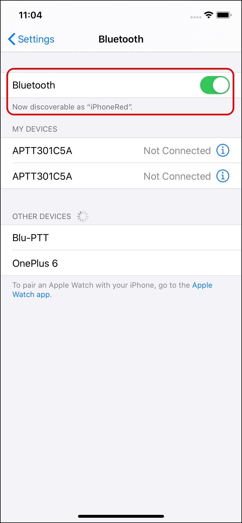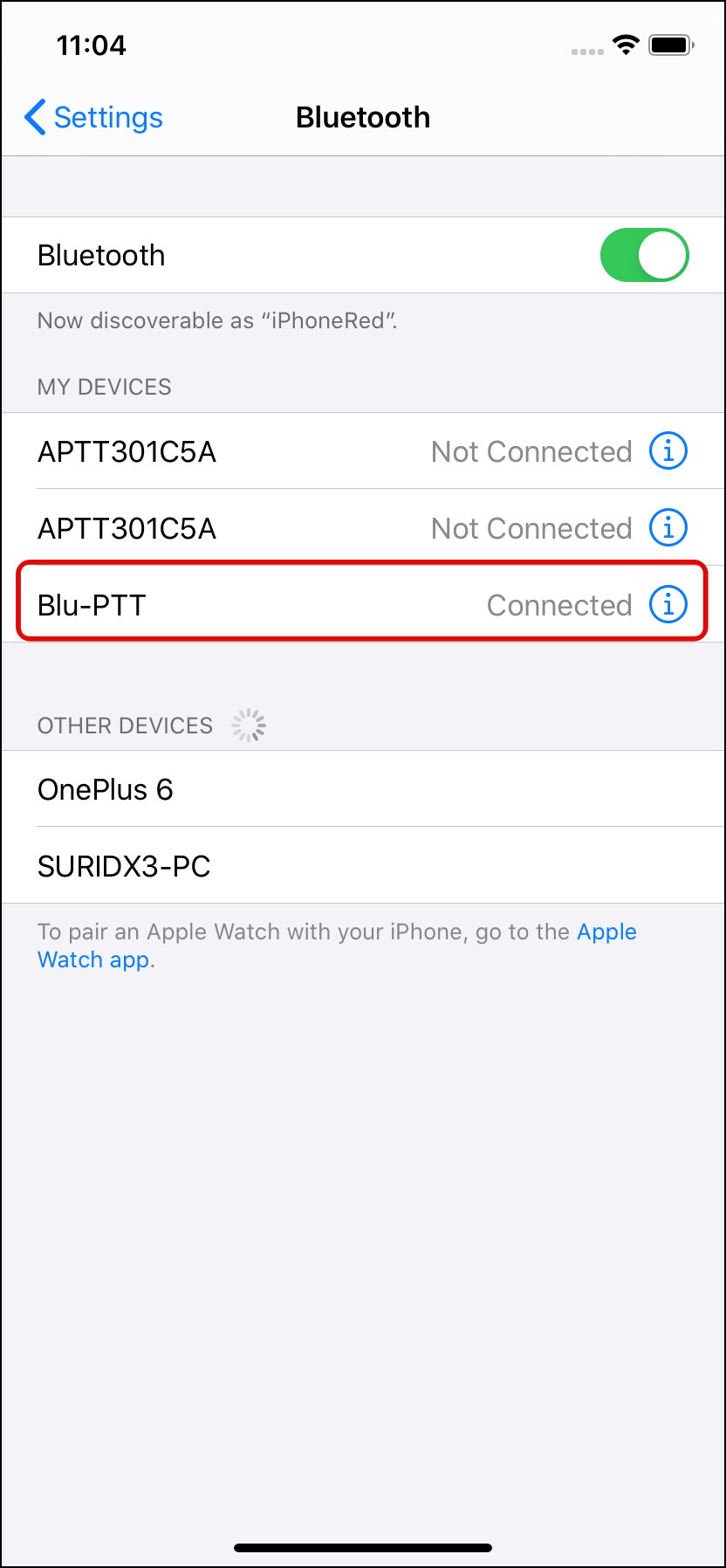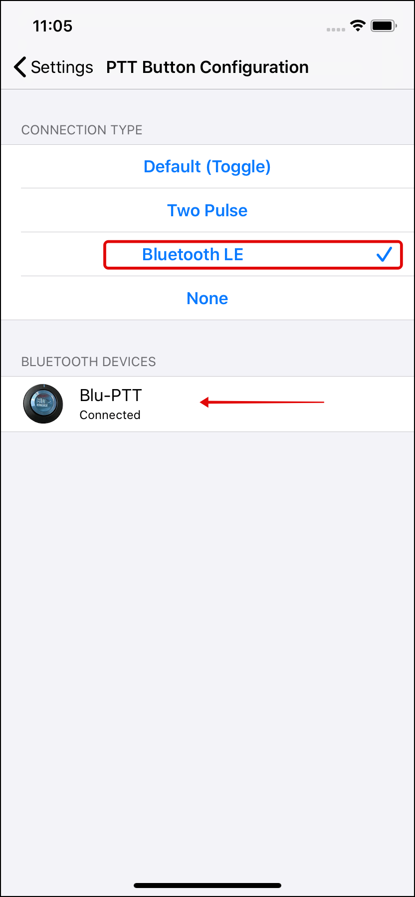 For iOS select "PTT Button" then "Bluetooth LE", the Blu-PTT will show below and say "Connected":